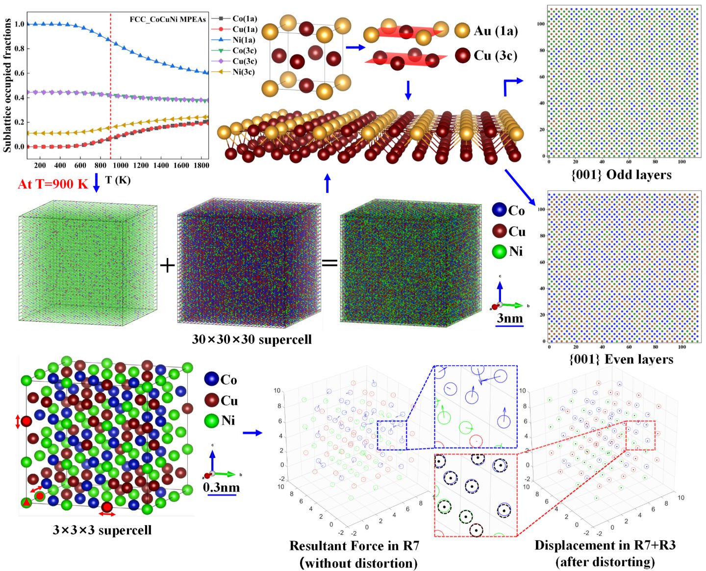 The inherent temperature-dependent sublattice preference of constituent atoms in FCC_CoCuNi multi-principal element alloys (MPEAs) is theoretically predicted by combining a two-sublattice model based on the L12_AuCu3 prototype with computational thermodynamics, which extends beyond the commonly-believed, yet unreasonable randomly mixing solid solution hypothesis. Based on the predicted sublattice occupied fractions (SOFs) and available computer resource, two MPEAs atom distributing models with different sizes are established for different applications, respectively, where the bigger size model is further employed to analyze statistically the atom distributing character quantitatively and graphically, while the smaller size model is employed to study the lattice distortion of MPEAs further using first-principles calculations density functional theory. The atom distributing configurations of some representative heat treatment temperatures, as well as the hypothetical randomly mixing structure are compared. It is revealed that FCC_CoCuNi MPEAs exhibit strong temperature-dependent ordering behavior. The SOFs-based configurations are (Ni1.0000)1a(Co0.4445Cu0.4444Ni0.1111)3c, (Co0.0653Cu0.0721Ni0.8626)1a(Co0.4227Cu0.4204Ni0.1569)3c, and (Co0.1574Cu0.1593Ni0.6833)1a(Co0.3920Cu0.3913Ni0.2167)3c at 100 K, 900 K, and 1400 K, respectively. Overall, Ni atoms always prefer to 1a sublattice and the preference tendency reduce a little bit at considerable high temperatures. The configurational entropies of FCC_CoCuNi MPEAs increase with the increase of heat treatment temperature, while they are considerably lower than that of the hypothetical ideal random solid solution. Based on the atom distributing model of MPEAs, the local atomic cluster characteristics are further investigated by statistically analyzing the coordination numbers of the constituent atom coordinated with the same type of atoms. The radial distribution function (RDF) further verified the atom aggregating behavior. For most family of crystal planes in FCC_MPEAs, except {1 1 1}, there are obviously different atom distributing characters between the even and odd layers. The atom distributing model of some representative bulk structure and surface structure are afforded valuably for reference and application both in experimental and theoretical investigation further. Thus, rich and indispensable structural genome data are afforded for the further research and development of the promise FCC_CoCuNi MPEAs intensively.